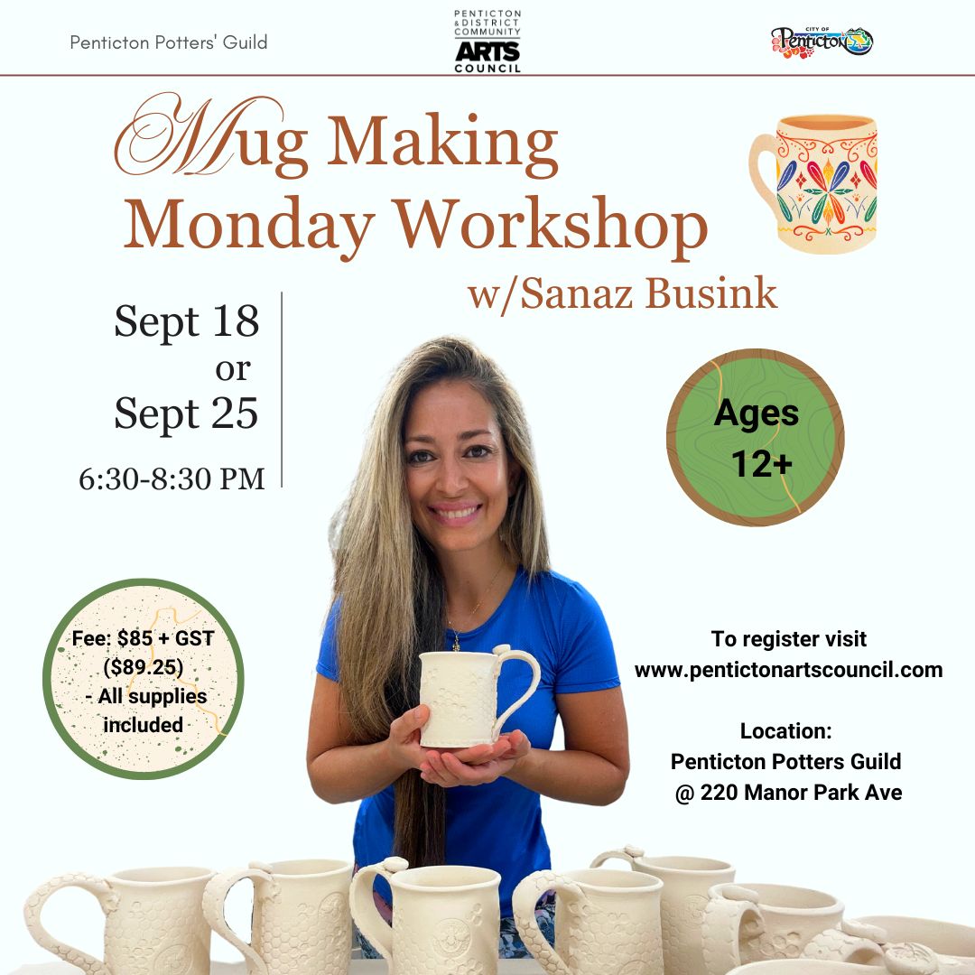 Don’t miss these new classes by Sanaz Busink: “Mug Making Monday” a one-night workshop at the Penticton Potters Guild. An ideal way to experience what it’s like to create something out of clay. She will show you how to transform lumps of clay into a mug masterpiece – Once you’ve finished making your mug, you can choose the colour of the glaze and you’ll have your finished handmade mug within 3-4 weeks, once we’ve glazed and fired it in the kiln! Please note that this is a hand-building class and does not involve using a potter’s wheel. This class is for anyone aged 12 and up (12-15 years old must be accompanied by an adult) Fee: $85 + GST each ($89.25 Total). All supplies are provided. Date: Monday, September 18th or Monday, September 25th Time: 6:30 pm to 8:30 pm Location: Leir House (220 Manor Park Ave) Registration: To register for one of these two nights you can email programs@pentictonartscouncil.com or else call the office at 250-492-7997. Payments can either be made in person at the office via cash/debit/credit or you can send an e-transfer to payments@pentictonartscouncil.com