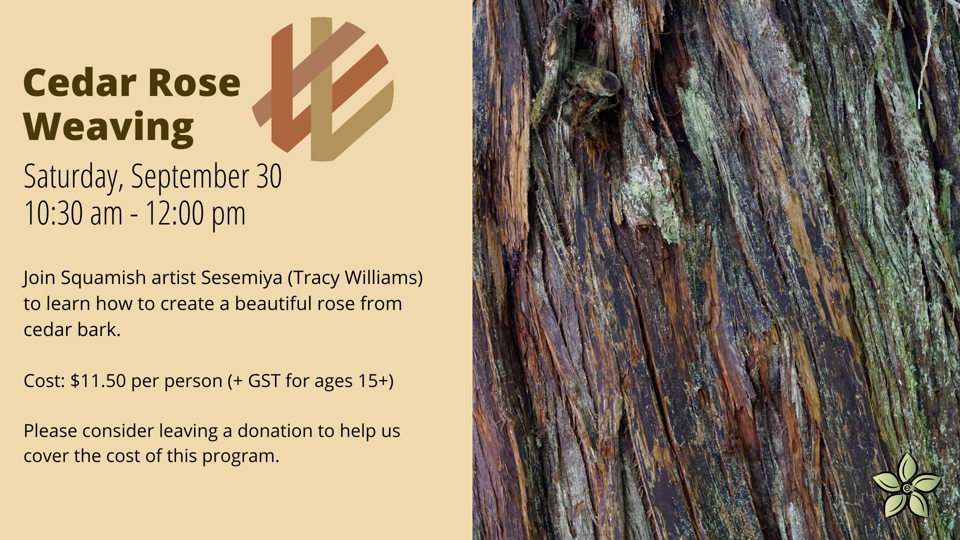 Cedar Rose Weaving Saturday, September 30 from 10:30 am to 12 pm Join weaver Sesemiya (Tracy Williams) to learn how to create a beautiful rose from cedar bark. Sesemiya is a Squamish Nation member, teacher and mother who comes from a long line of basket weavers. Suitable for ages 8+. Cost per person is $11.50, plus GST for ages 15+. long line of basket weavers. Register Here: https://ecologycentre.zaui.net/booking/web/#/default/activity/68?