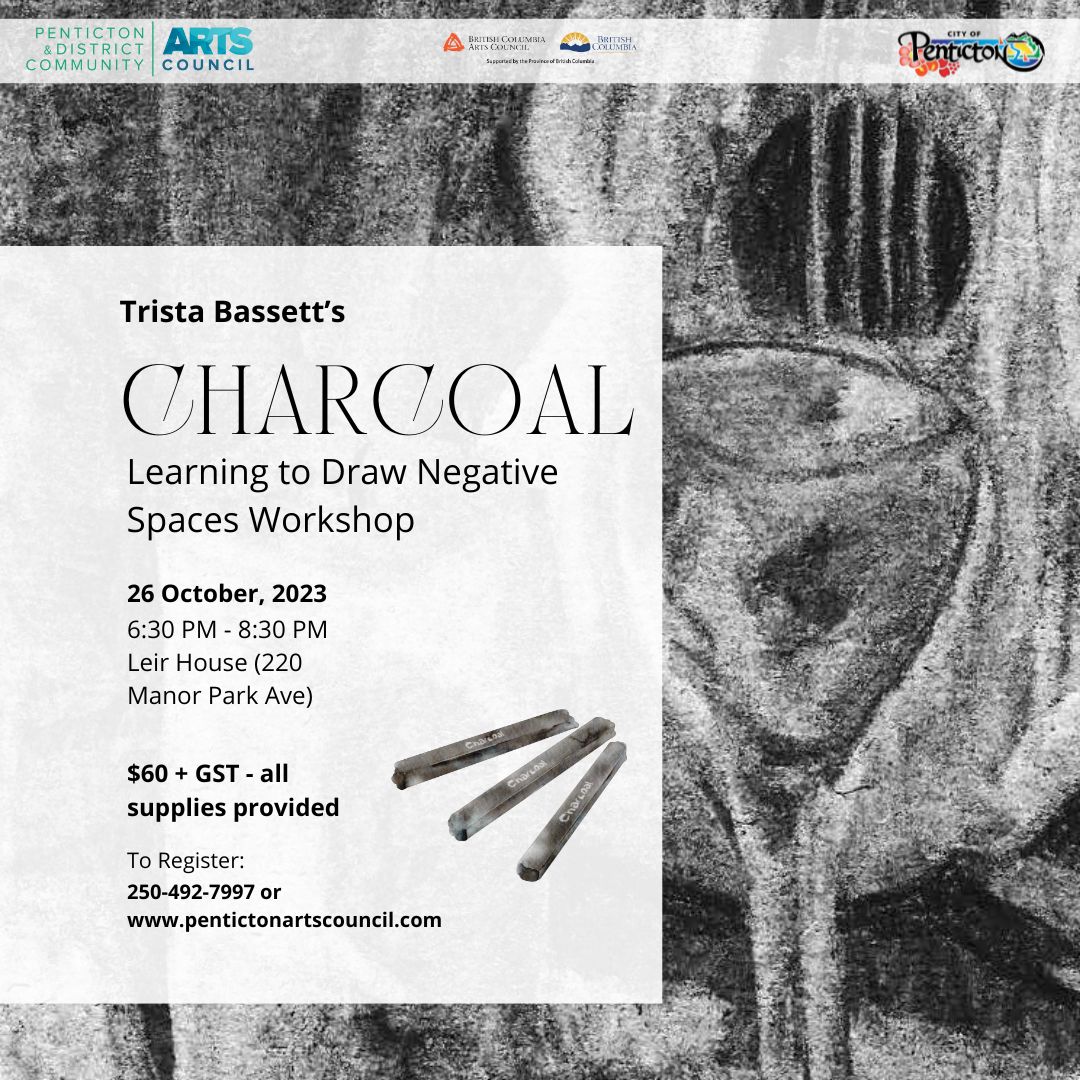 Join the talented Trista Bassett as she introduces you to drawing with charcoal, playing with negative spaces, and drawing still life. For this workshop, it’s recommended you bring along a few small objects with you that you want to play with for your still life. Fee: $60 + GST each ($63 Total). All supplies are provided. Date: Thursday, October 26th Time: 6:30 pm to 8:30 pm Location: Leir House (220 Manor Park Ave) Registration: To register for either session you can email programs@pentictonartscouncil.com or else call the office at 250-492-7997.