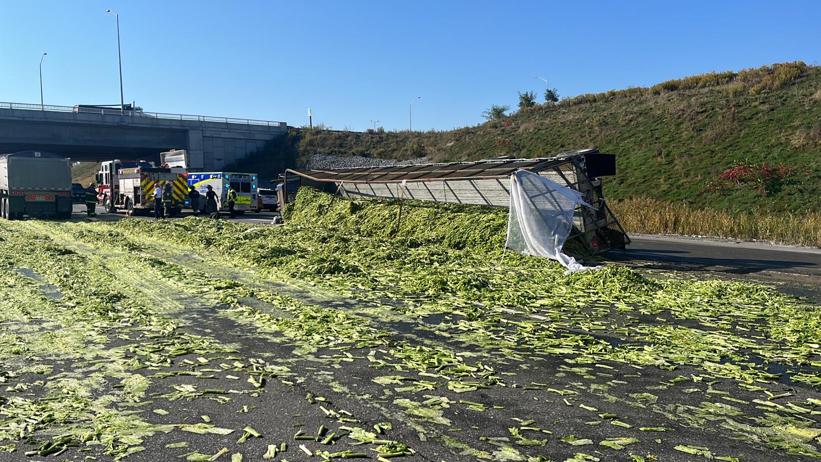 Police issued a post on X, formerly known as Twitter, about the rollover just after 11 a.m. on Tuesday. Several images show an entire truckload of celery sticks along the highway.