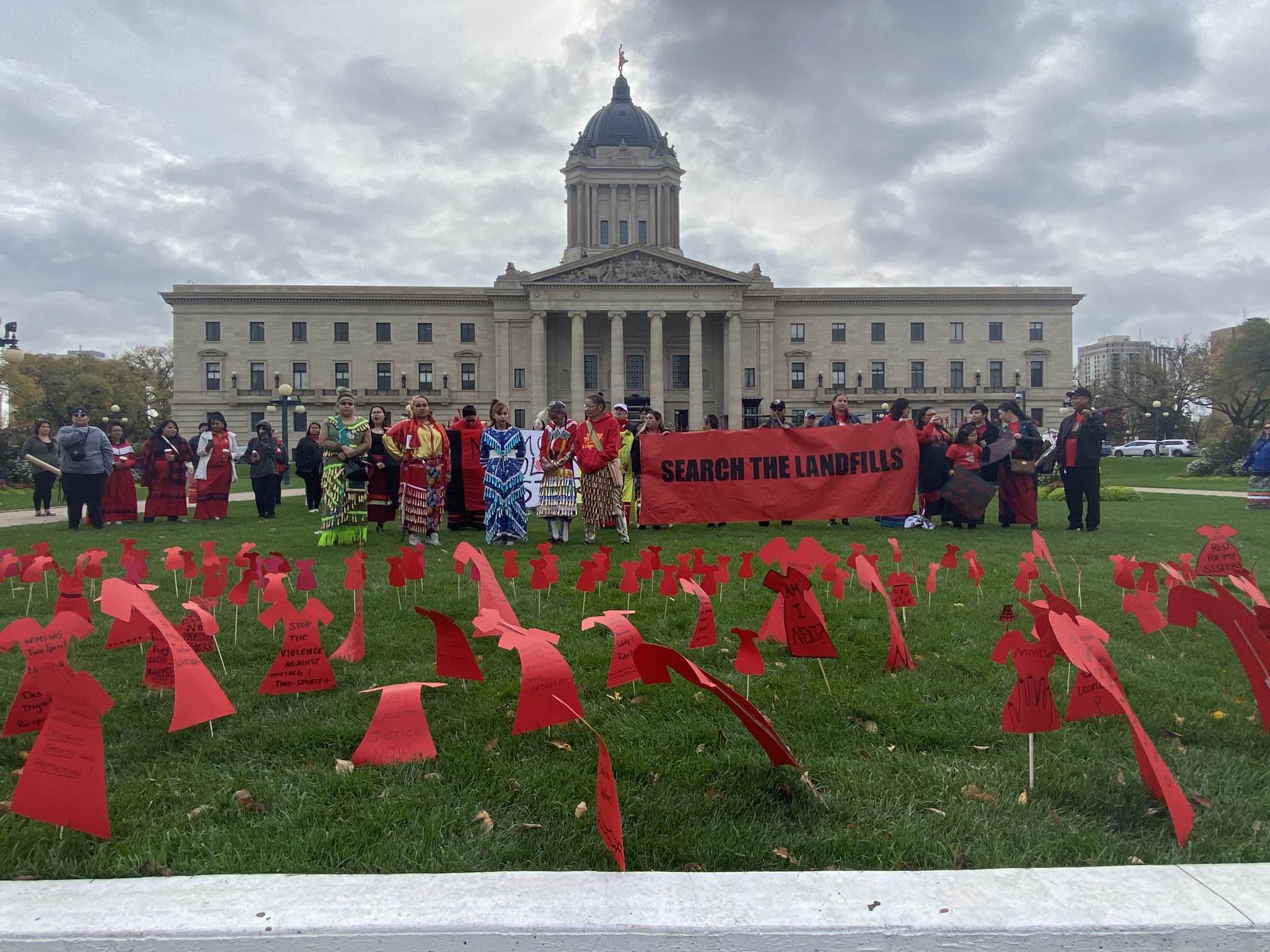 Less than 12 hours after the Manitoba New Democrats swept the Progressive Conservatives to form a majority government, 231 red dresses jutted out from the lawn of the legislative grounds.