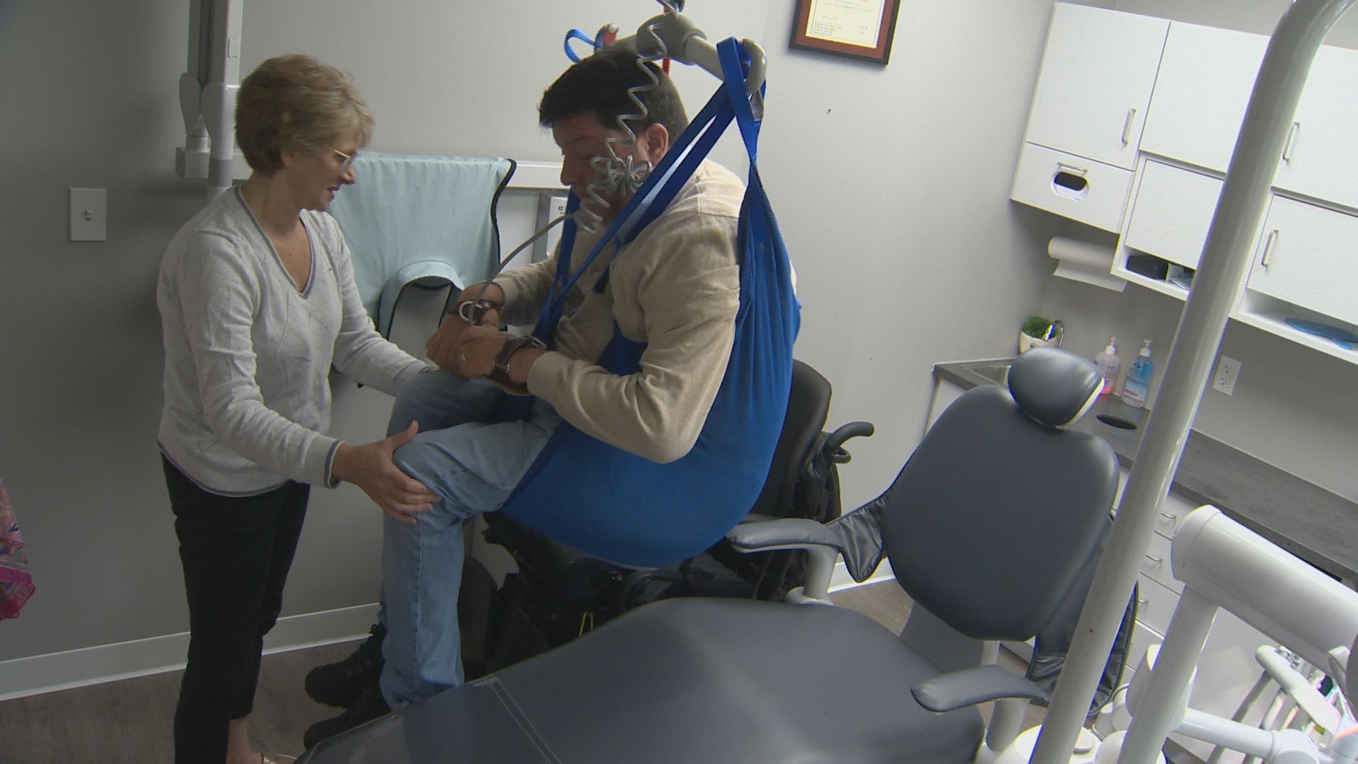 Patients use a sling, which attaches to a lift connected to the ceiling to hoist themselves onto the dentist’s chair. The process takes less than a minute and creates an easier way to access care.