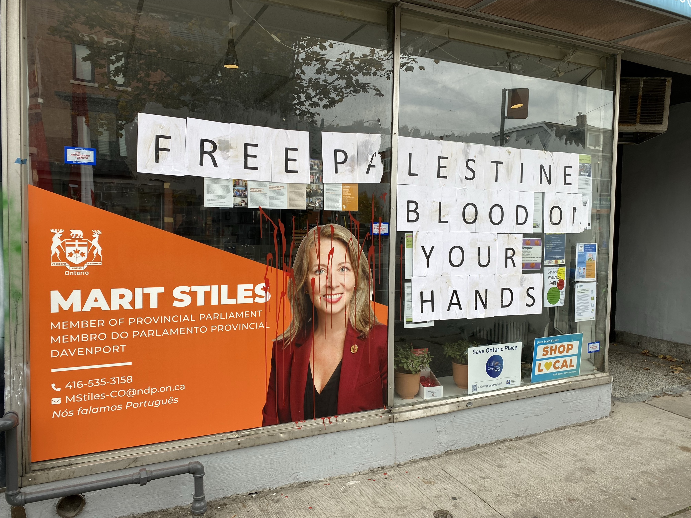 On Tuesday, printed letters were glued to Stiles’ Toronto office with the words, “Free Palestine, blood on your hands.” Red paint also appeared to have been dripped onto a photo of Stiles in her office window.