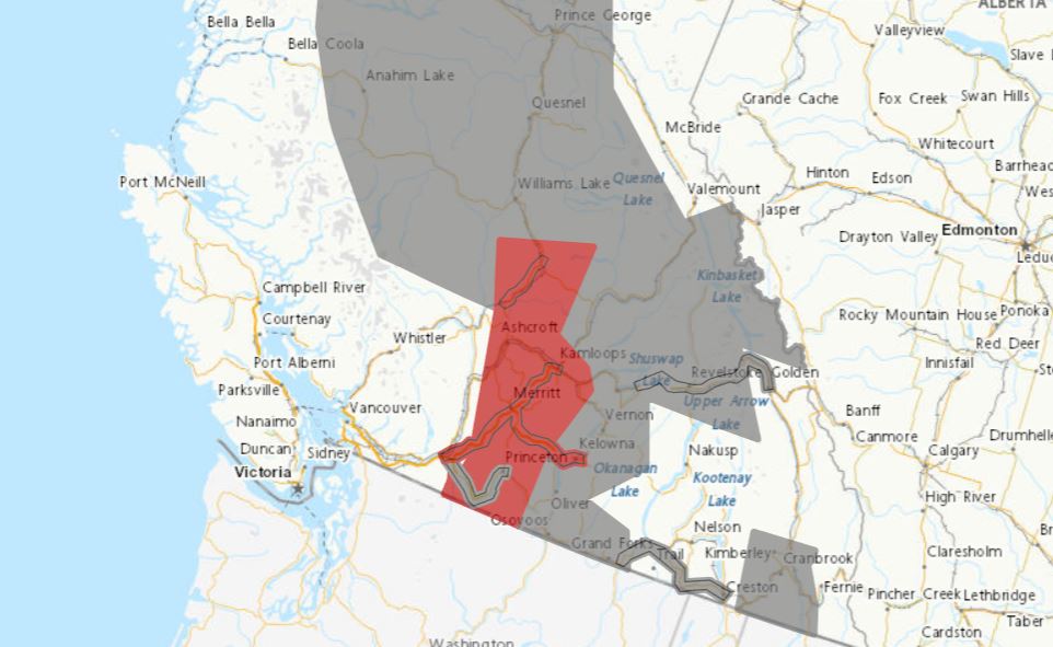 Issued at noon on Tuesday by Environment Canada and updated on Wednesday morning, the alert stretches from north of Prince George, through the Cariboo, and into the Okanagan to the U.S. border. It also includes pockets in the Kootenays.