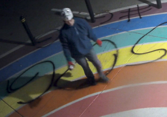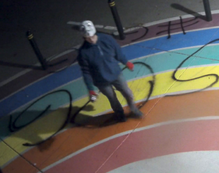 Rainbow art along a sidewalk in Kelowna, B.C., was vandalized recently, and police are reaching out to see if the public can identify the suspect.