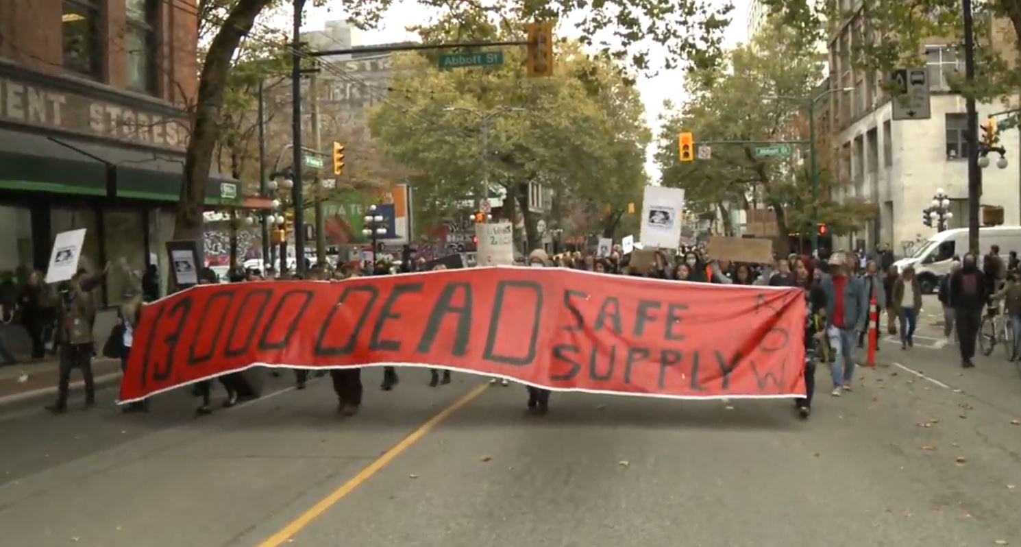 Friday’s demonstration comes days after an expert panel led by B.C.’s chief coroner recommended the province massively expand its safe supply program, arguing offering clean drugs without a prescription would be the safest way to cut down on toxic drug deaths.
