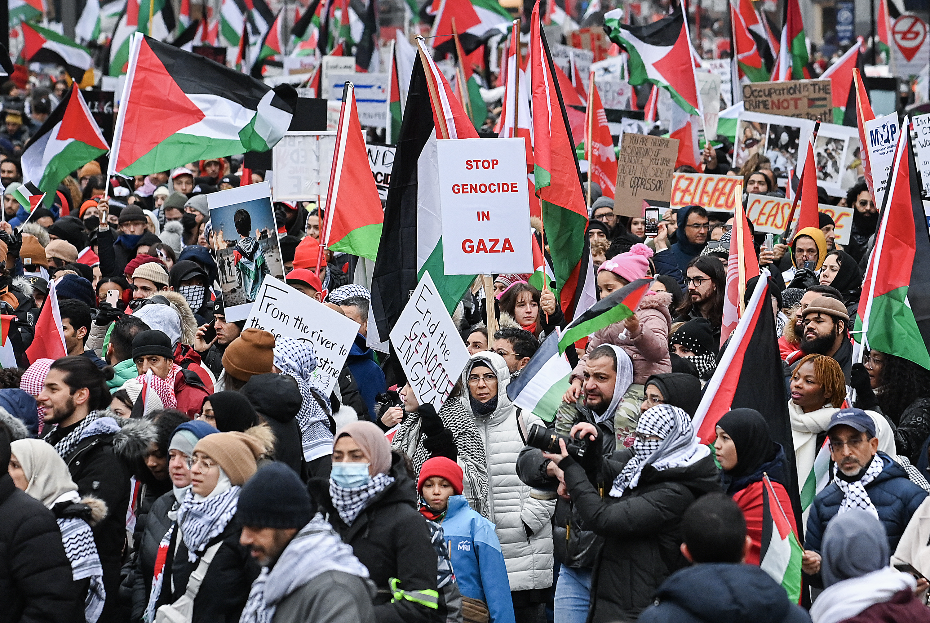 Tens of thousands in Montreal demonstrated in support of Palestinians in Gaza on Saturday, drawing attention to the humanitarian crisis and demanding Prime Minister Trudeau call for an immediate ceasefire.