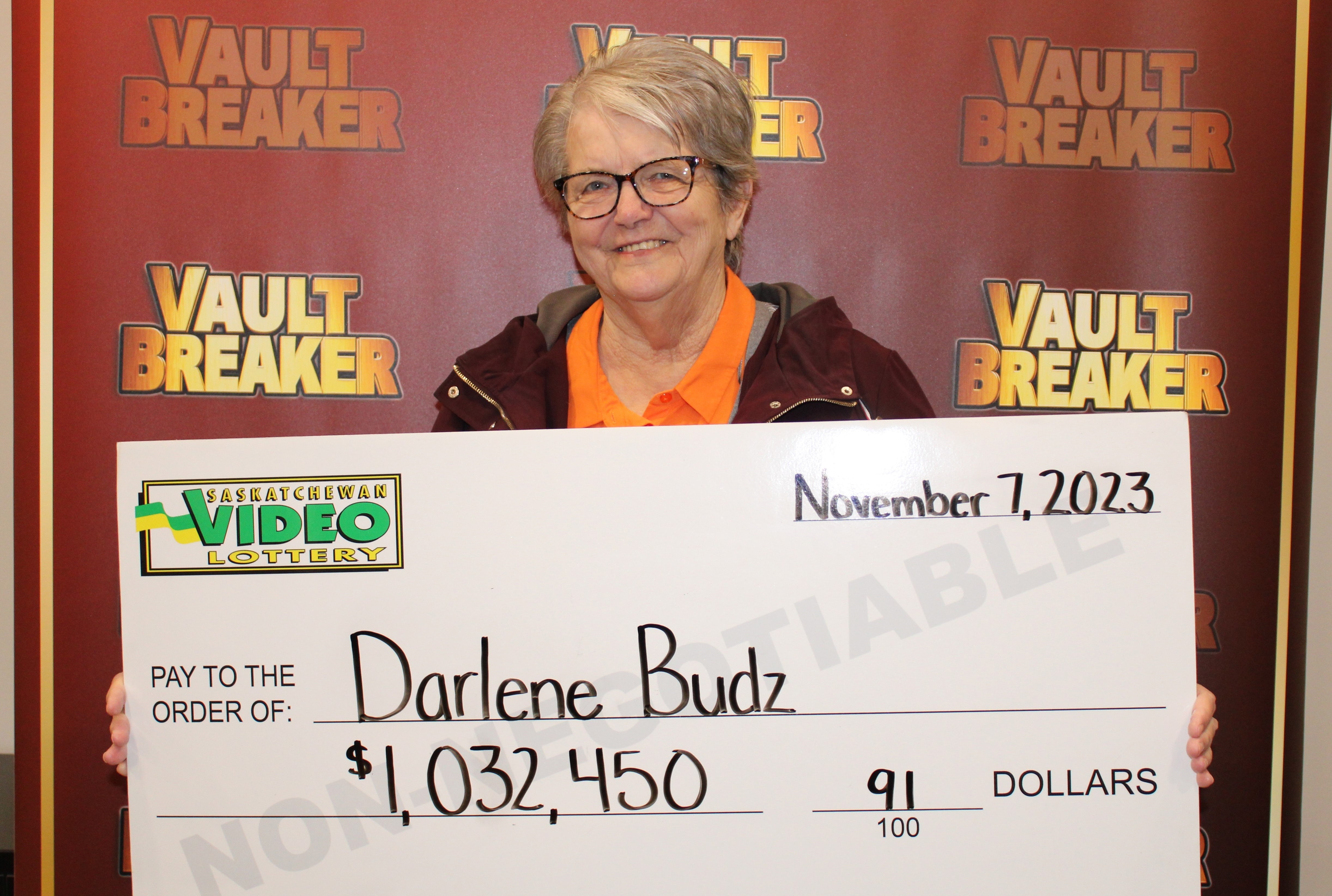 Darlene Budz from Humboldt, Sask., is $1 million richer after winning the grand jackpot on Vault Breaker at Pioneer Hotel.