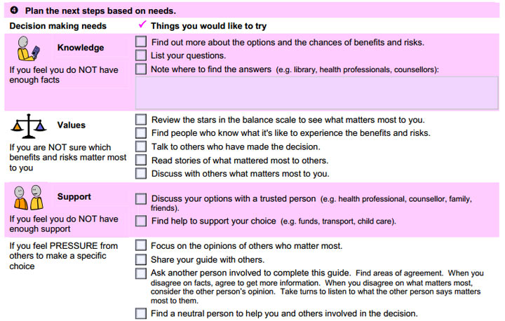 CHEO has also created an “Ottawa Family Decision Guide” for people facing health decisions to fill in (pictured above). The guide, developed in Ottawa but relevant to anyone, is essentially a worksheet where you can write out your options, reasons for and against, how much each reason matters to you, and how the decision will affect others in your family. The goal is to break down your decision by first clarifying it, exploring options, and planning your next steps based on your needs.