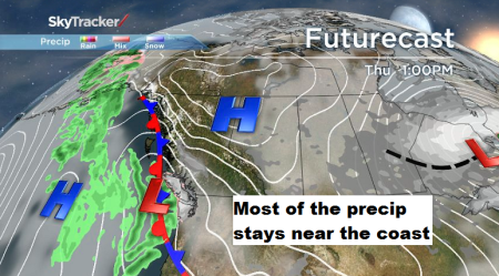 A coastal disturbance embedded in our strong northerly flow, could kick up a light dusting for the Southern Interior Thursday, while our cold north wind will continue to funnel through the valley causing breezy conditions at times.
