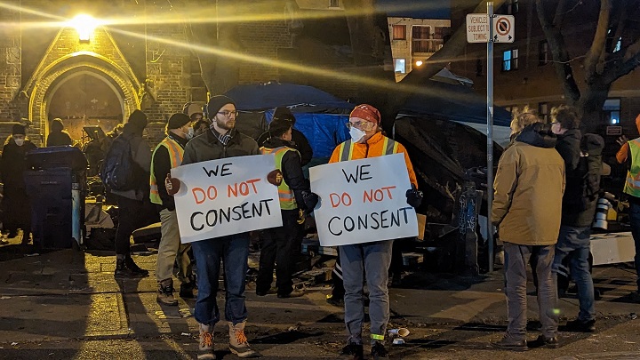 The encampment is located on Bellevue Avenue near College Street, right outside of the St. Stephen-In-The-Fields Anglican Church on what the city calls a “city-owned right-of-way.”