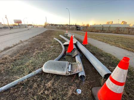“The vehicle started to rotate clockwise, and the driver-side struck a light pole. The pole was dislodged, and the vehicle crossed over Bonnybrook Road S.E., and continued through a wooden fence, before coming to a rest in a nearby vehicle scrapyard,” police said.