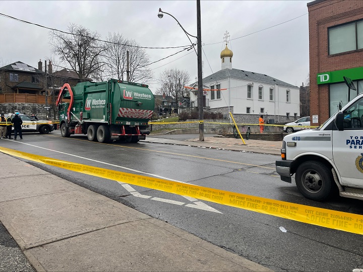 “Information we have right now is that a garbage truck was travelling westbound on St. Clair Avenue. As it proceeded to go northbound on Wionna Drive, it struck the female who was in the crosswalk. The female has been pronounced and presently we’re looking to notify next of kin.”