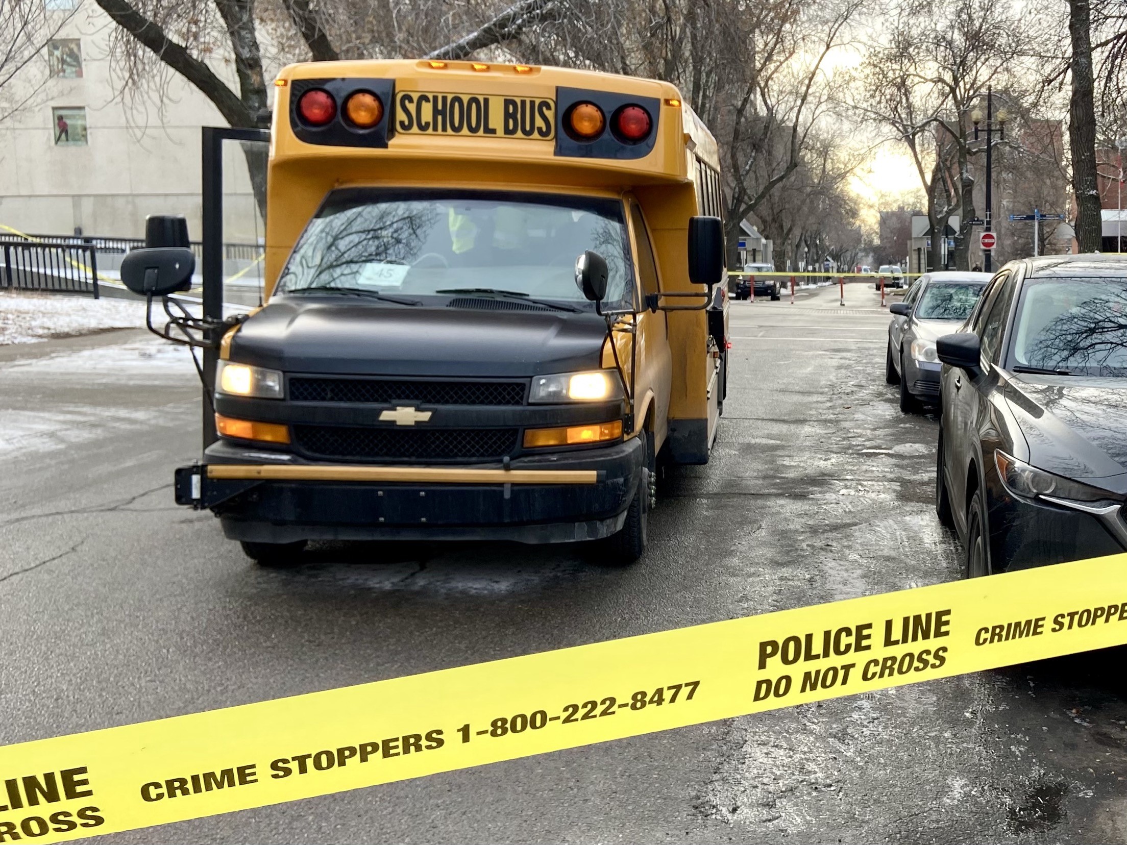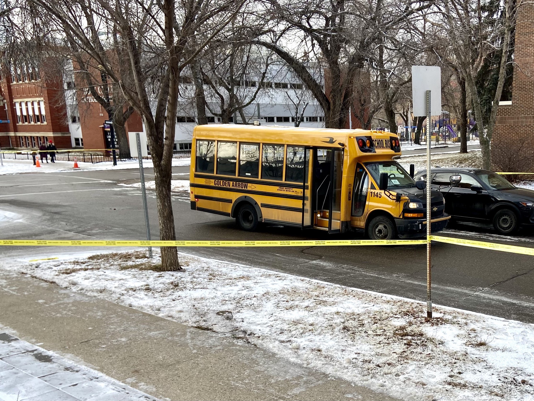 At around 8:30 a.m., the 45-year-old woman driving the school bus was turning left from 99 Avenue, heading north onto 110 Street, when she struck the pedestrian.