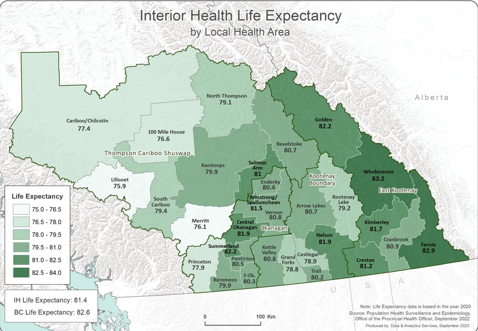 Across the whole of B.C. the average life expectancy is 82.6 years, according to data collected from B.C. statistics and recently complied by the provincial health officer. Within Interior Health, however, the average 81.4 years, which isn’t too far off the provincial average and a relatively insignificant difference.