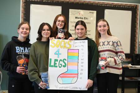Five IB students, Madeline Marks, Maddie Rossit, Mhairi Milne, Adriana Richards and Christina Morrison, orchestrated a We Help Two Socks for Legs campaign where they sold over 100 pairs of funky socks for their Creativity-Activity-Service project.