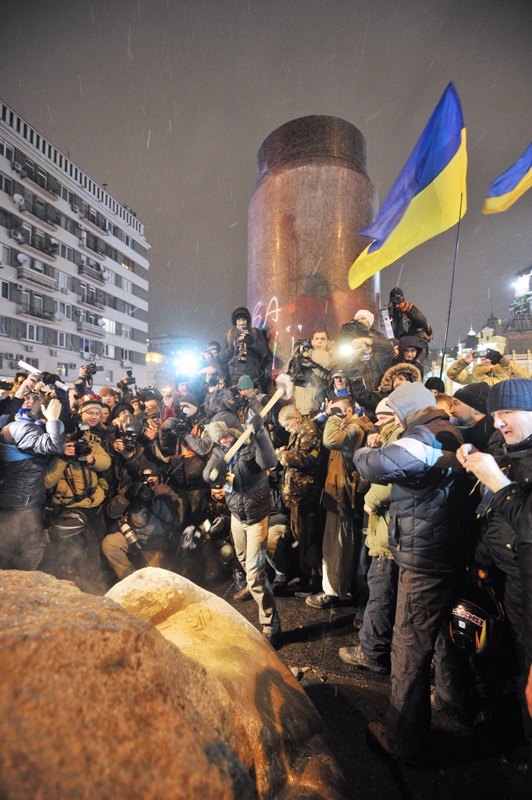ABOVE: Crowds toppled a statue of Soviet state founder Vladimir Lenin in the Ukrainian capital