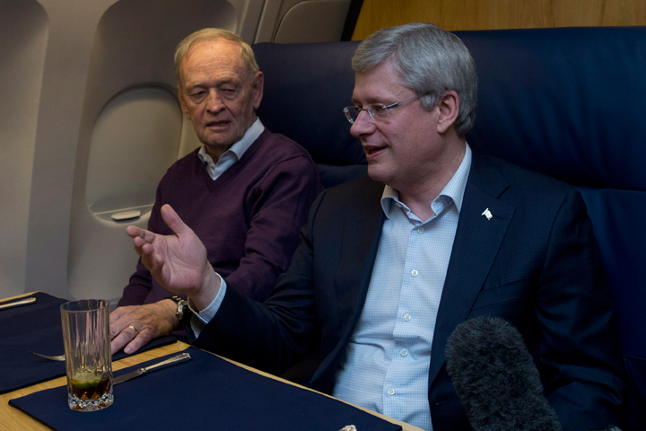 Prime Minister Stephen Harper and three of his predecessors – Jean Chretien, Brian Mulroney and Kim Campbell – sat in close quarters as they winged their way to South Africa late Sunday in the elaborate front cabin of a government Airbus.