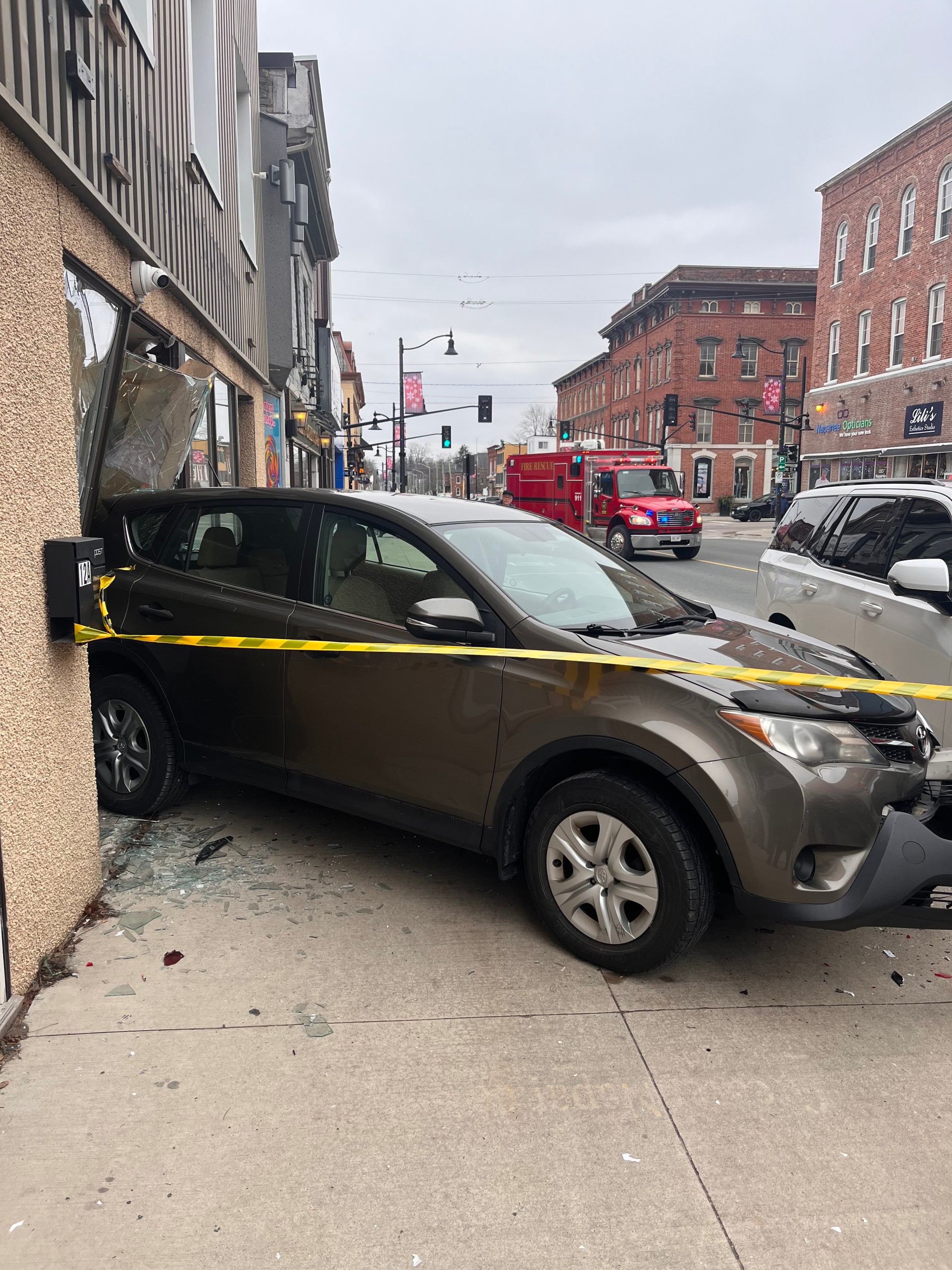 An elderly woman has been charged after a car crashed into another vehicle and then into a building in Napanee on Tuesday.