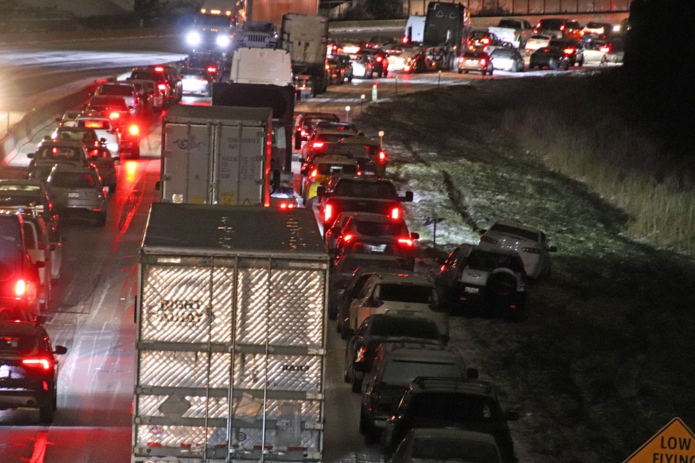 The icy road conditions led to the cars colliding with each other and it caused total gridlock with no one being able to get through.