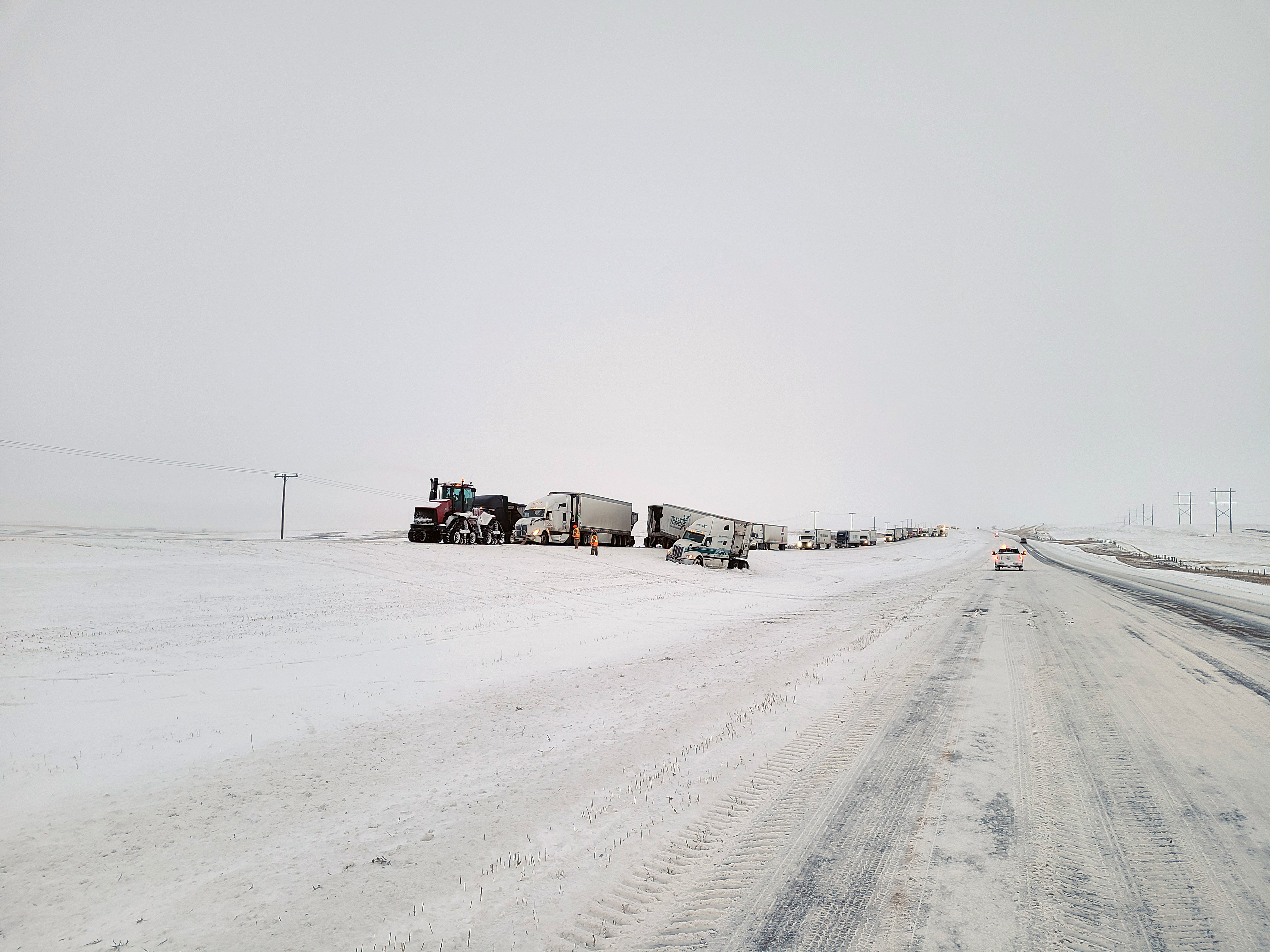 “This section of road is on a downward slope and the highway is pure ice,” RCMP said. “At least five semis were involved in collisions and another semi jackknifed fifteen minutes ago when the kilometers-long lineup started moving slowly again. Please use extreme caution if you are in the area as police officers and other responders are working to open the road and are outside their vehicles.