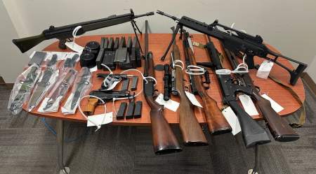 Police said they seized two prohibited automatic rifles, one prohibited semi-automatic rifle, one prohibited automatic handgun, one restricted handgun, two non-restricted semi-automatic rifles, one non-restricted shotgun, 33 prescribed prohibited magazines and four bayonets.