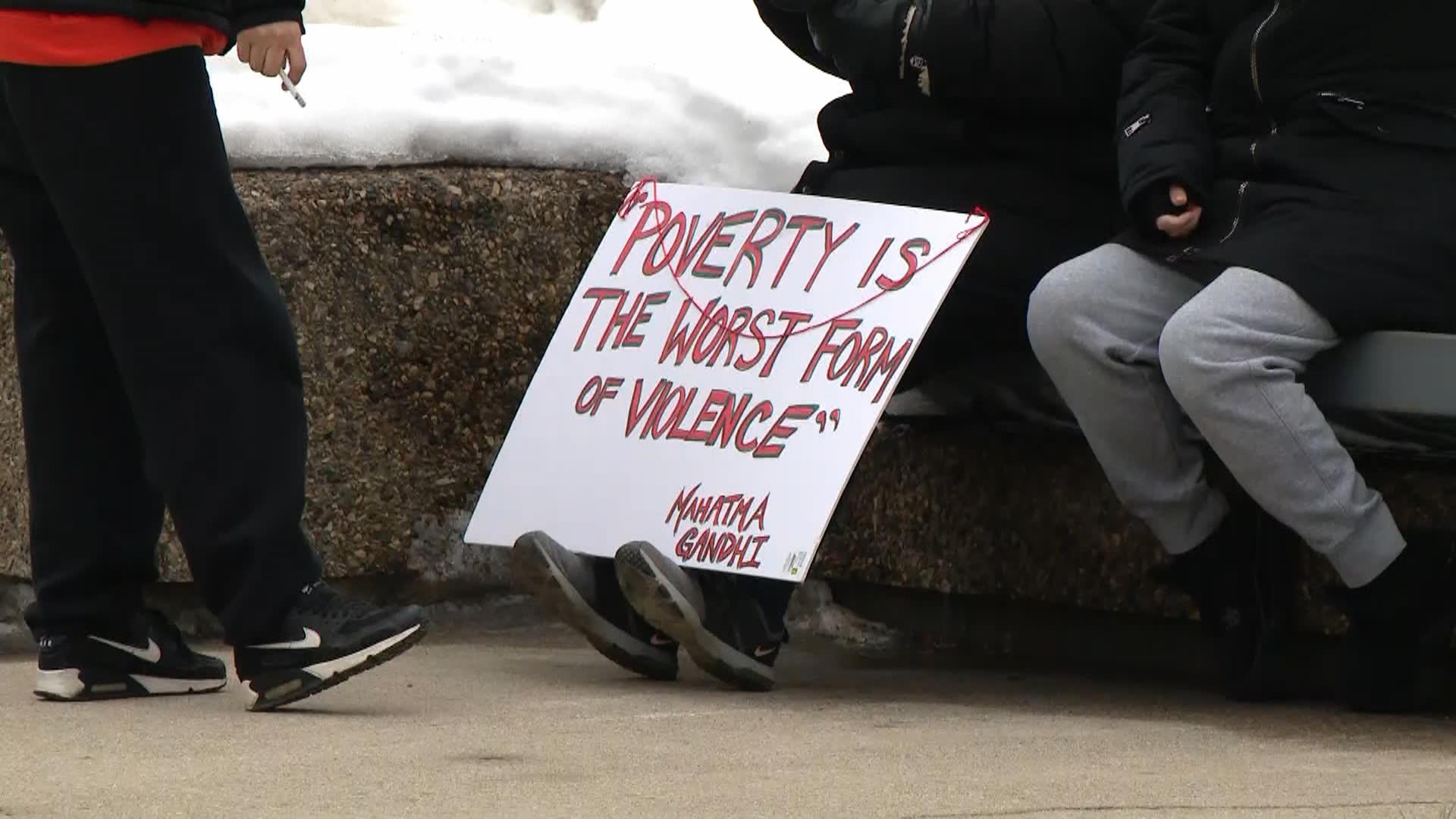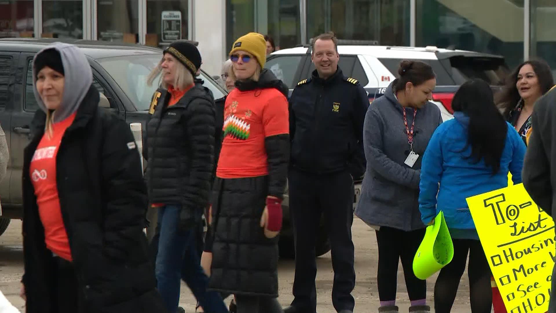 Dozens of people gathered outside Saskatoon City Hall Thursday after to march to the Emergency Wellness Centre in support of the city’s homeless population.