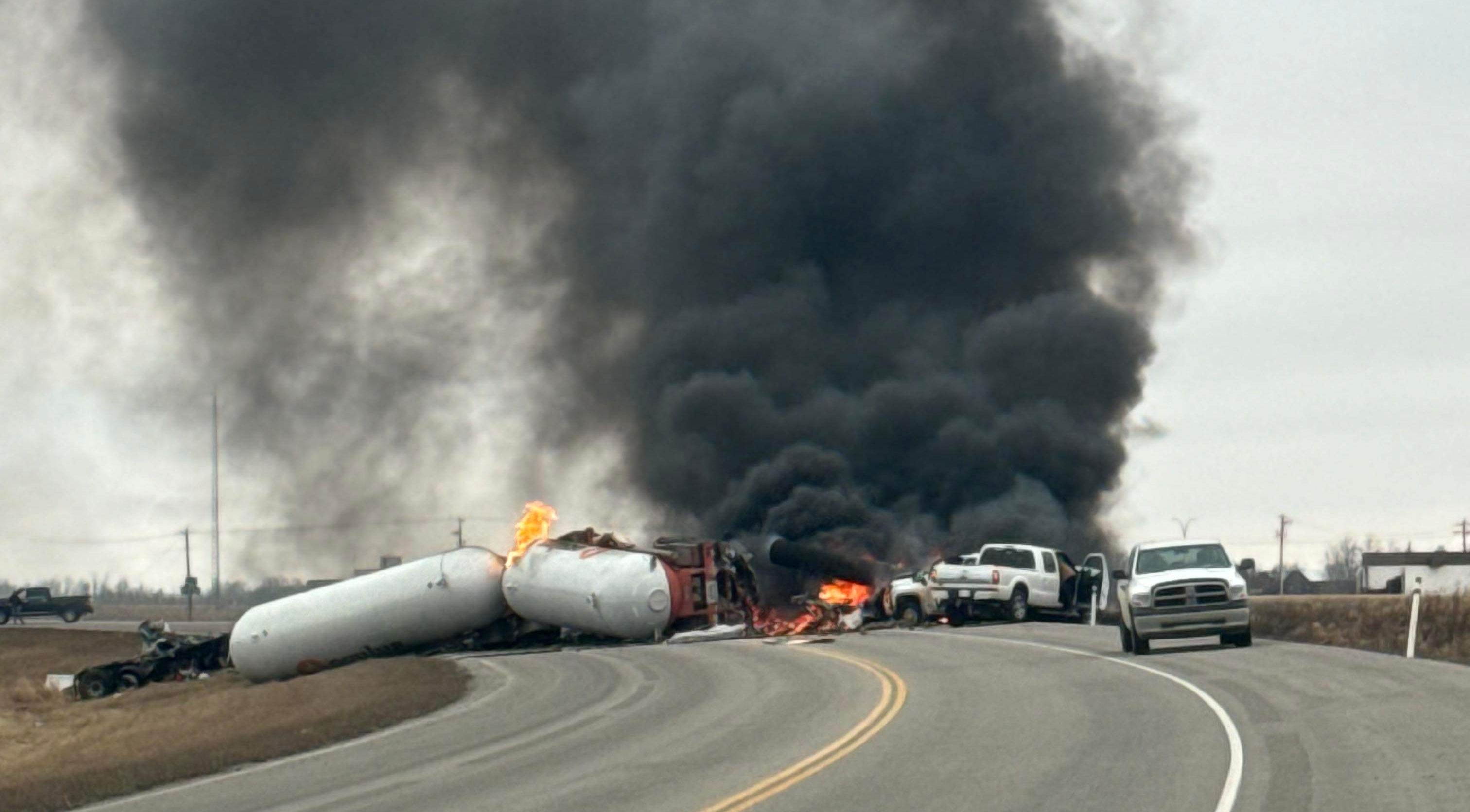 Several vehicles were involved in the crash, including a fuel tanker truck, another semi hauling segments of pipe, and two smaller pickup trucks.