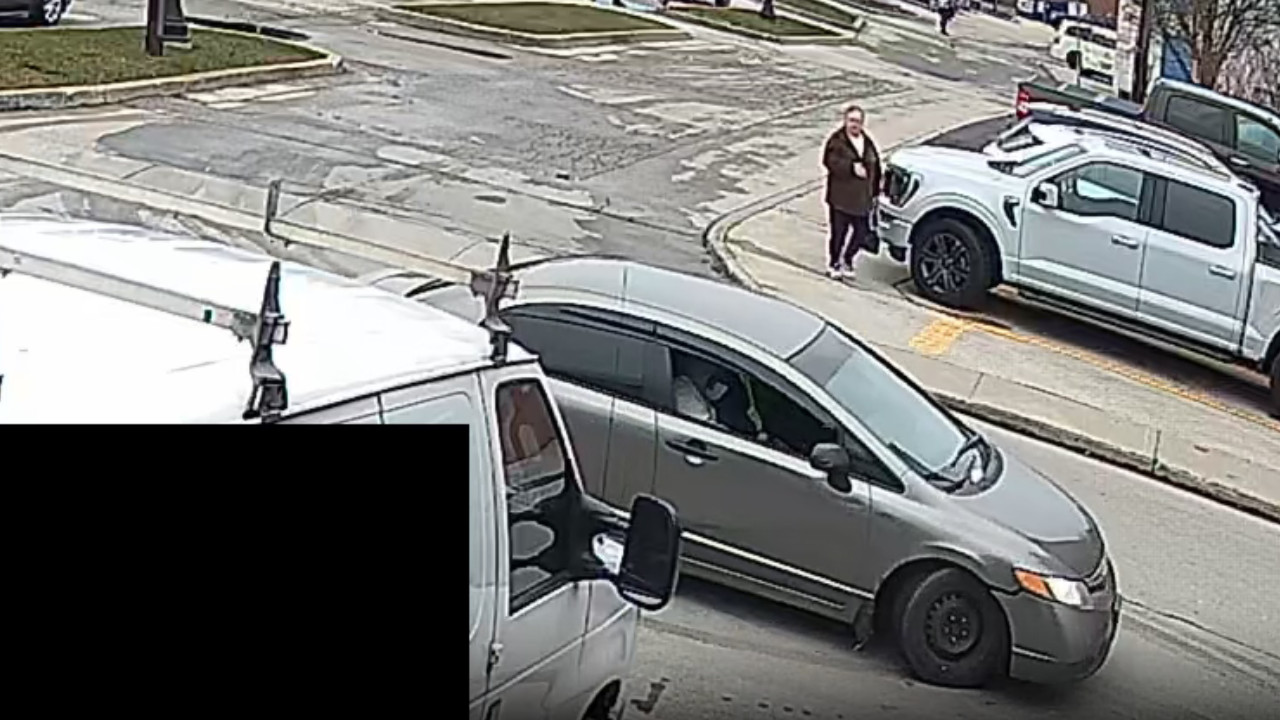 The suspect car, shown on surveillance video fleeing the area, is a 4-door grey or beige Honda Civic with an Ontario licence plate.