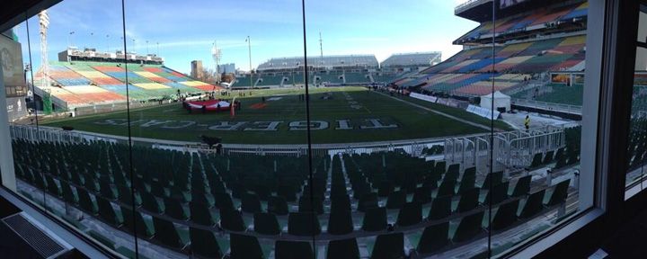 Taylor: At the start of the 2013 football season, I found myself living in Saskatoon for my first TV job, thinking I would be attending the 2013 Grey Cup as a fan. I had owned season tickets for six years, dating back to my time in university here in Regina, and had already bought my Grey Cup tickets. When I was living in Saskatoon, I still traveled back on weekends and attended games as a fan. Then in July, a new opportunity presented itself, and I accepted the job in the sports department at Global Regina, drastically changing how and where I watched a football game. From wearing my Rider jersey sitting in Section 27, I was now wearing my dress clothes, sitting up in the press box.