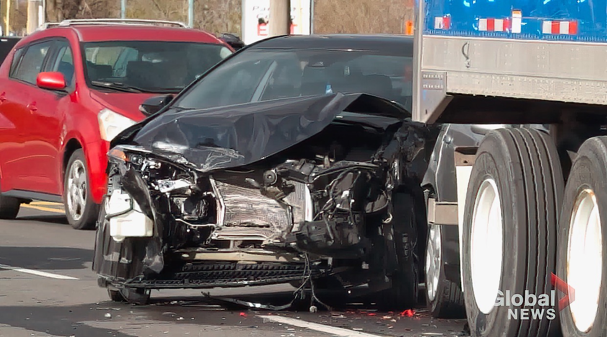 The chain-reaction collision involved several vehicles, one which rear-ended a transport truck, causing heavy front-end damage to all cars involved.