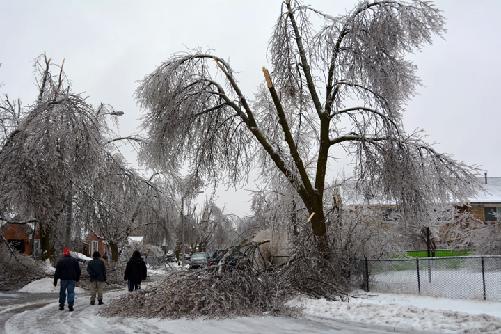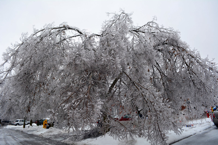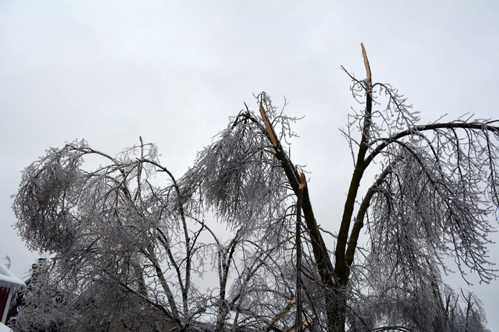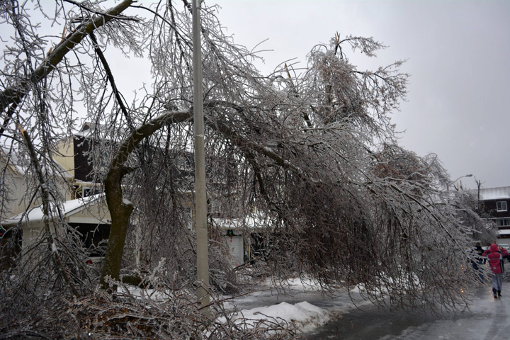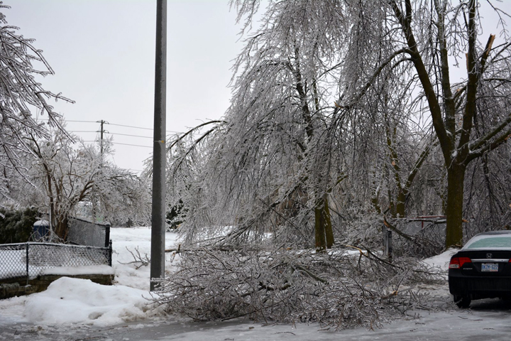 On Primrose Crescent, a particularly hard-hit street, broken trees and branches acted as obstacles for moving cars while the weight of freezing rain snapped other trees in half.