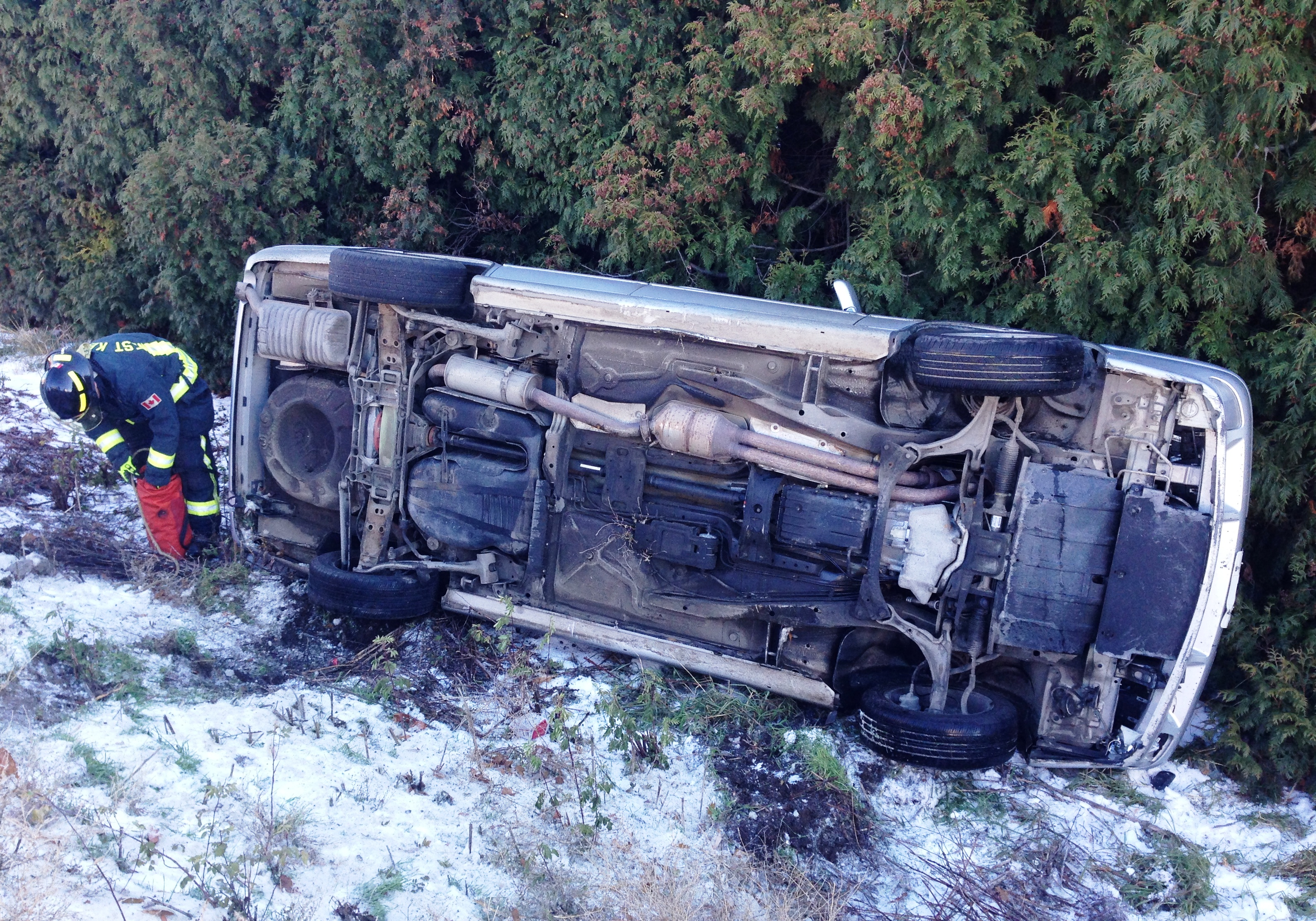 The vehicle ended up rolling onto its side – up against some cedar hedges.