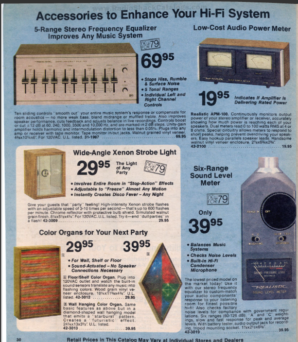 One of the best days of the year was the arrival of the new Radio Shack catalogue. What wondrous new devices would it contain that could be used to take my home stereo to the next level? I thought I’d hit the jackpot with page 30 of 1979 edition of the catalogue. It featured five must-have items. A five-range stereo equalizer, a stereo power meter, a device that measured sound levels, a strobe light, and a couple of things known as “colour organs.”
