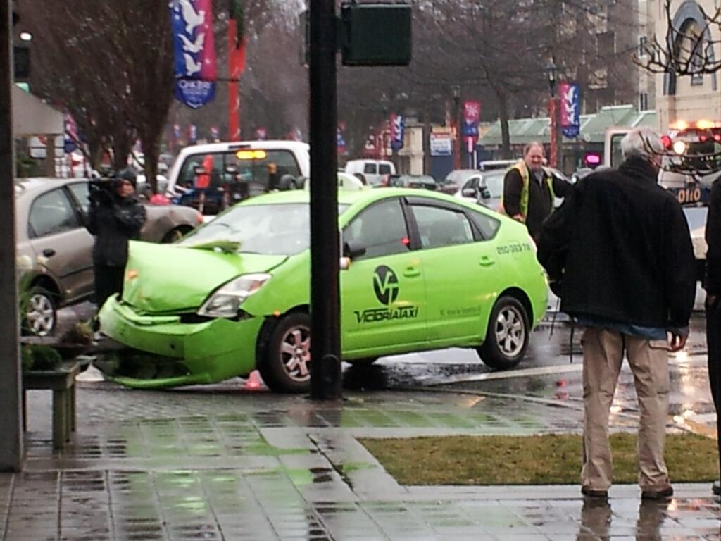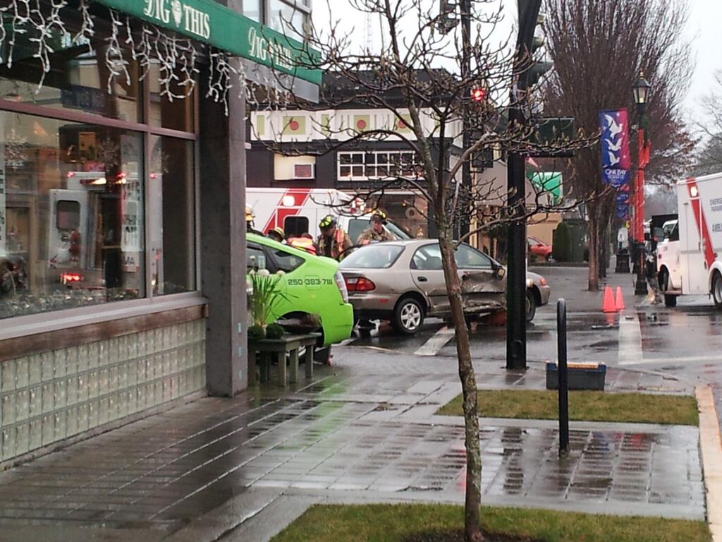 The taxi hit two other vehicles before driving over a sidewalk and crashing into the doors of Dig This, located at 1990 Oak Bay Avenue.