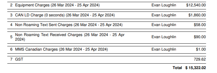 More than $12,000 of that bill went toward equipment charges, with the rest going towards long-distance and roaming charges.