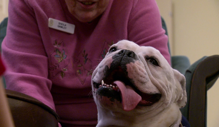 SASKATOON – A Saskatoon English bulldog is being put to work to help ease the stress of the holidays at a local seniors home.
