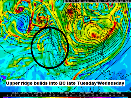 Flurries today will ease off by tomorrow afternoon when an upper ridge builds in the BC Interior.