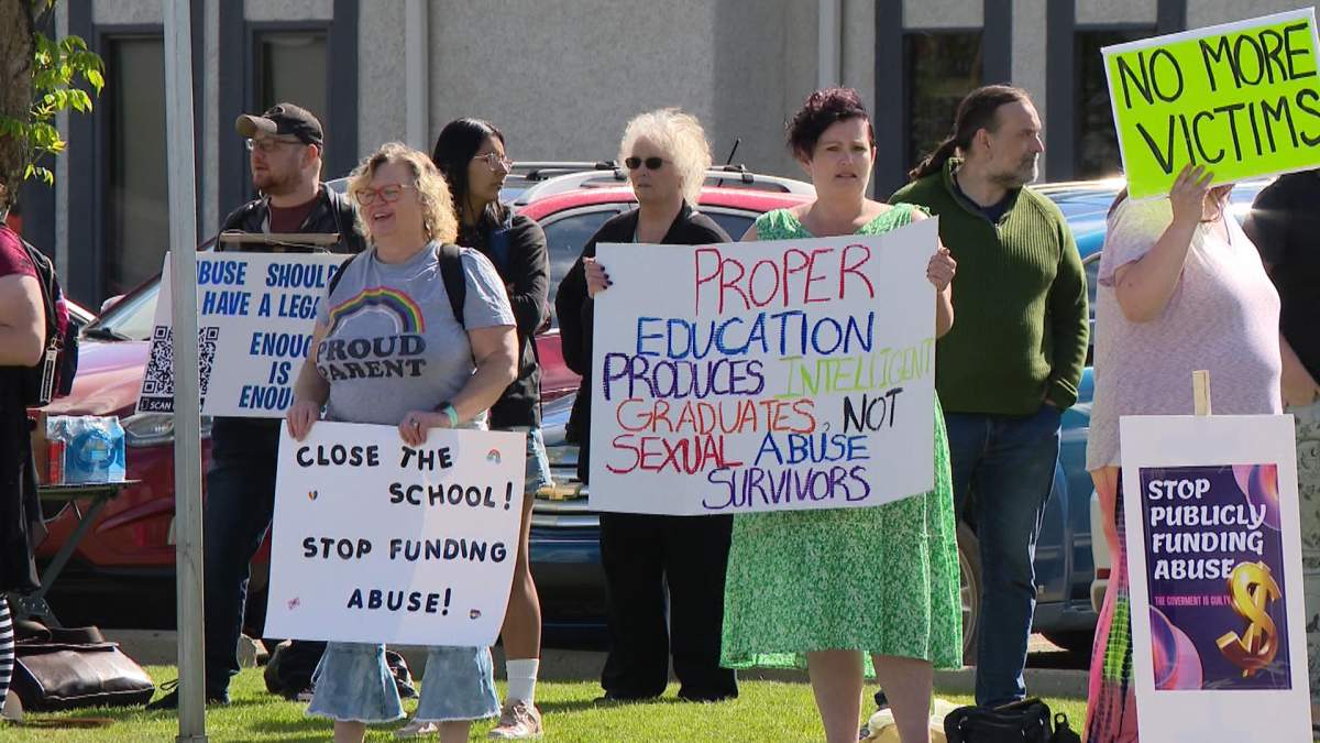 Former students of Legacy Christian Academy in Saskatoon and other protestors gathered outside Mile Two Church on Sunday, calling for the government to stop funding the school.