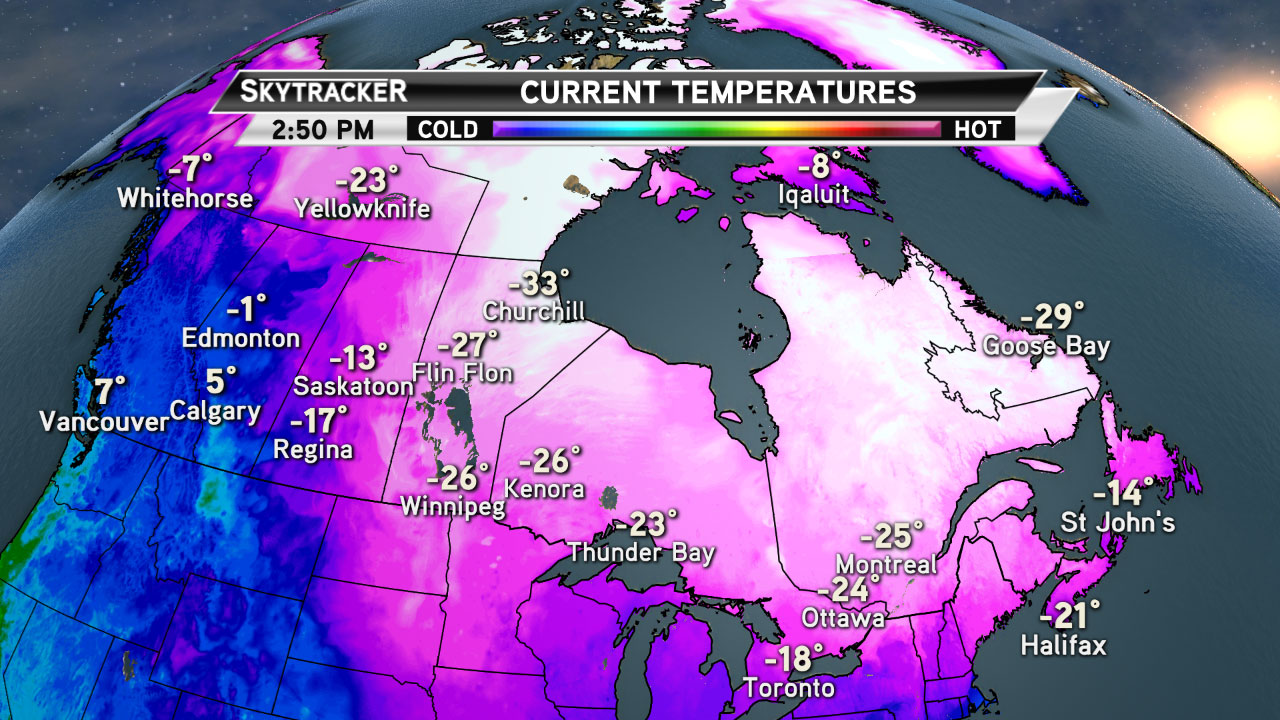 In Ontario and Manitoba, temperatures ranged from -18 C in Toronto, to -26 C in Winnipeg. Iqaluit? a balmy -8 C.