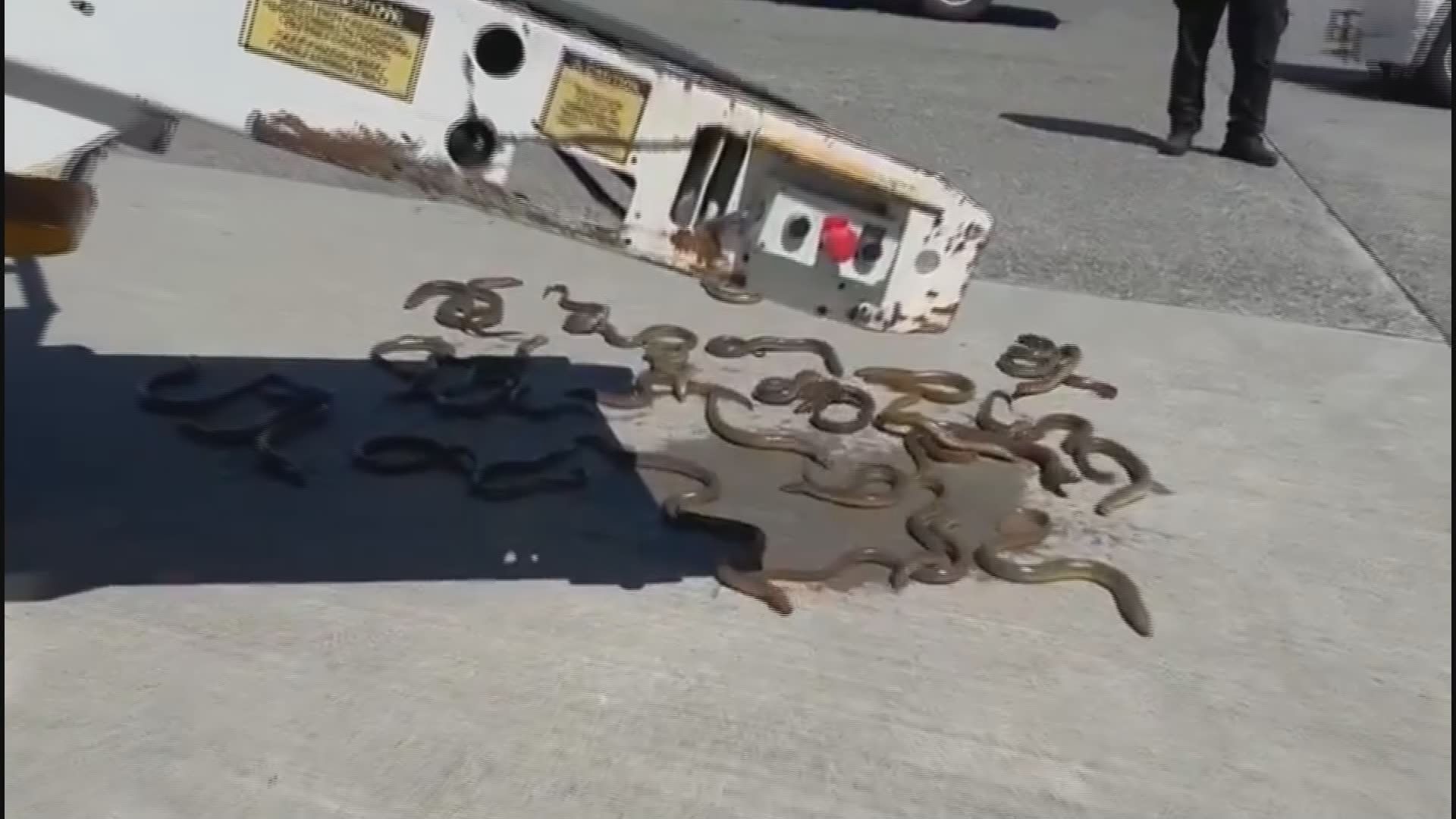 Video posted to social media shows dozens of live eels squirming on the apron surface around an Air Canada plane at YVR.