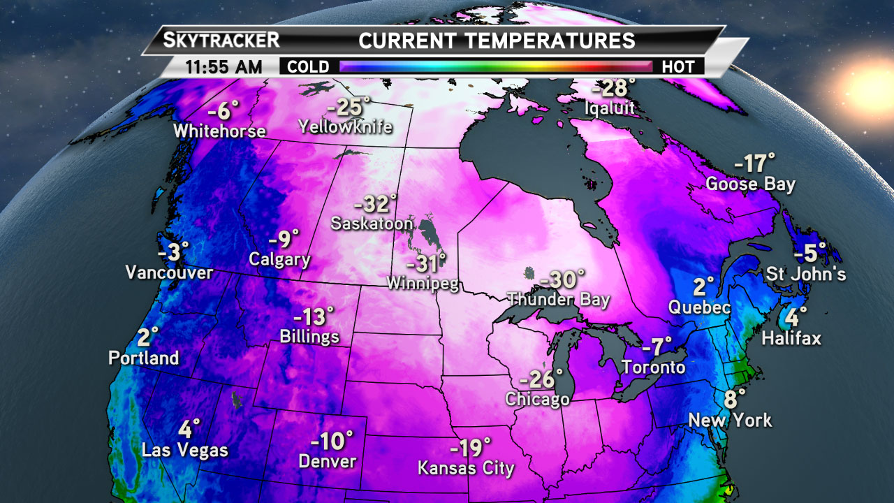 The deep cold is being mostly felt east of Alberta in cities like Saskatoon, Regina, and across Northern Ontario.