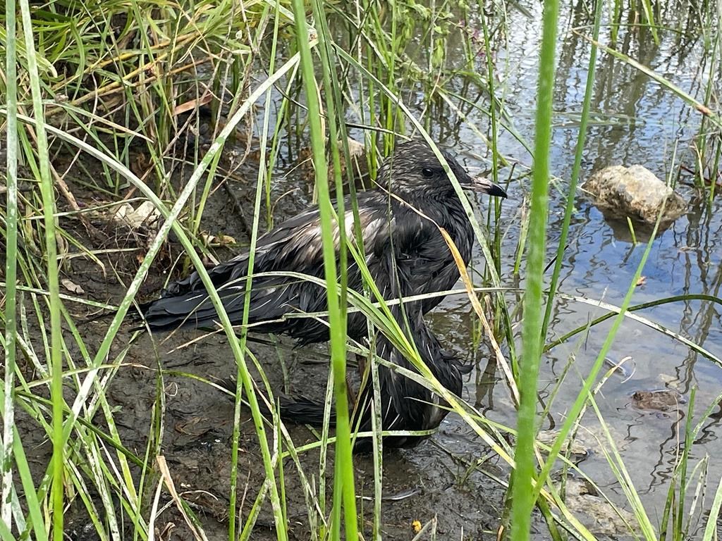 The Canadian Coast Guard was involved in early efforts to contain the motor oil but transferred responsibility to the province when it became clear the source of the pollution came from land.