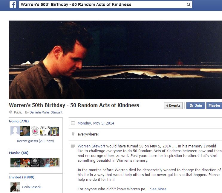 Starting on New Year’s Day, Stewart started a Facebook group inviting both friends and strangers to commit 50 random acts of kindness this year. So far, nearly 800 people have signed up.