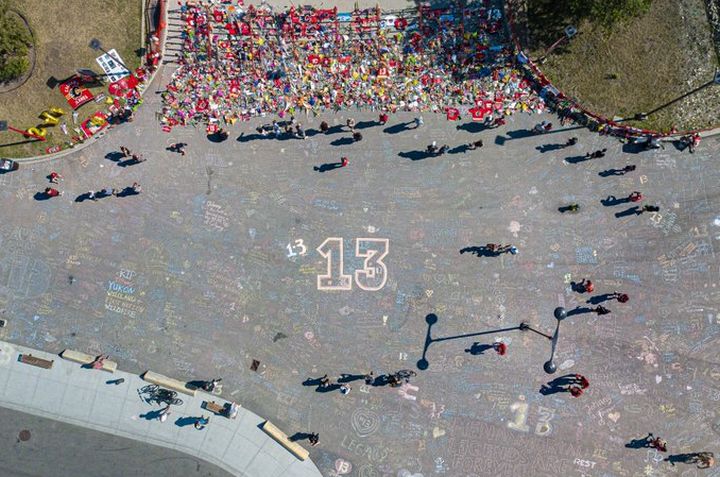 Outside the arena where Calgary’s NHL team plays, a memorial features jerseys, flowers and an enormous stretch of concrete covered in tributes written in chalk to pay respect to the 31-year-old hockey player.