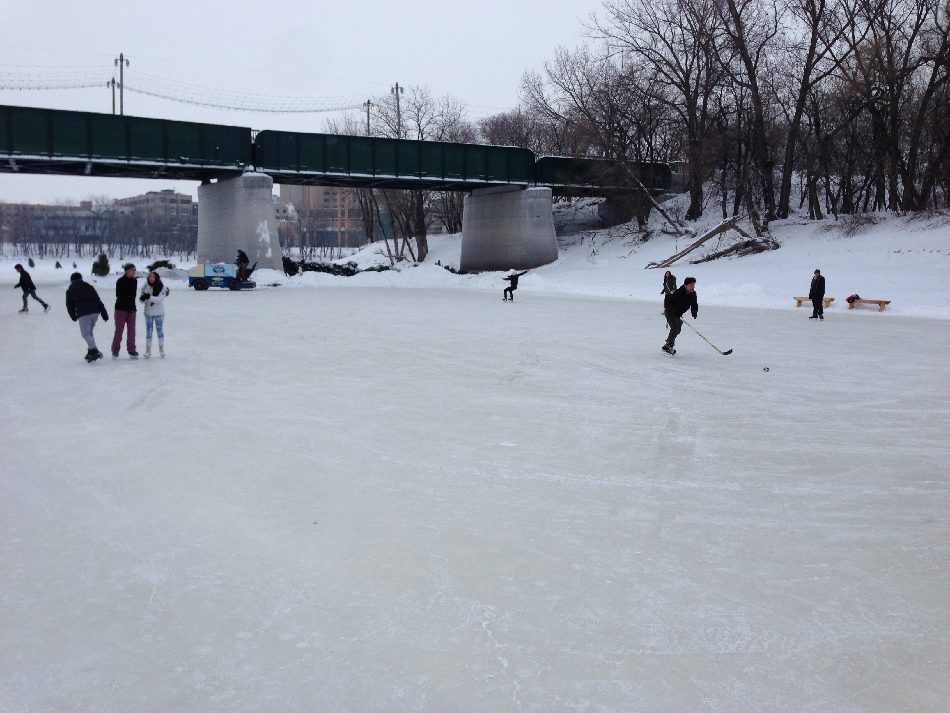 The river skating trail this year is known as the Red River Mutual Trail. The two large hockey rinks at the Forks port are also open.