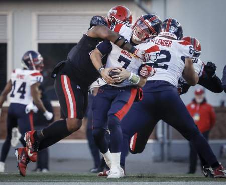 Montreal’s Sean Thomas-Erlington blocked a Cody Grace punt and corralled the ball in the end zone early in the second quarter.