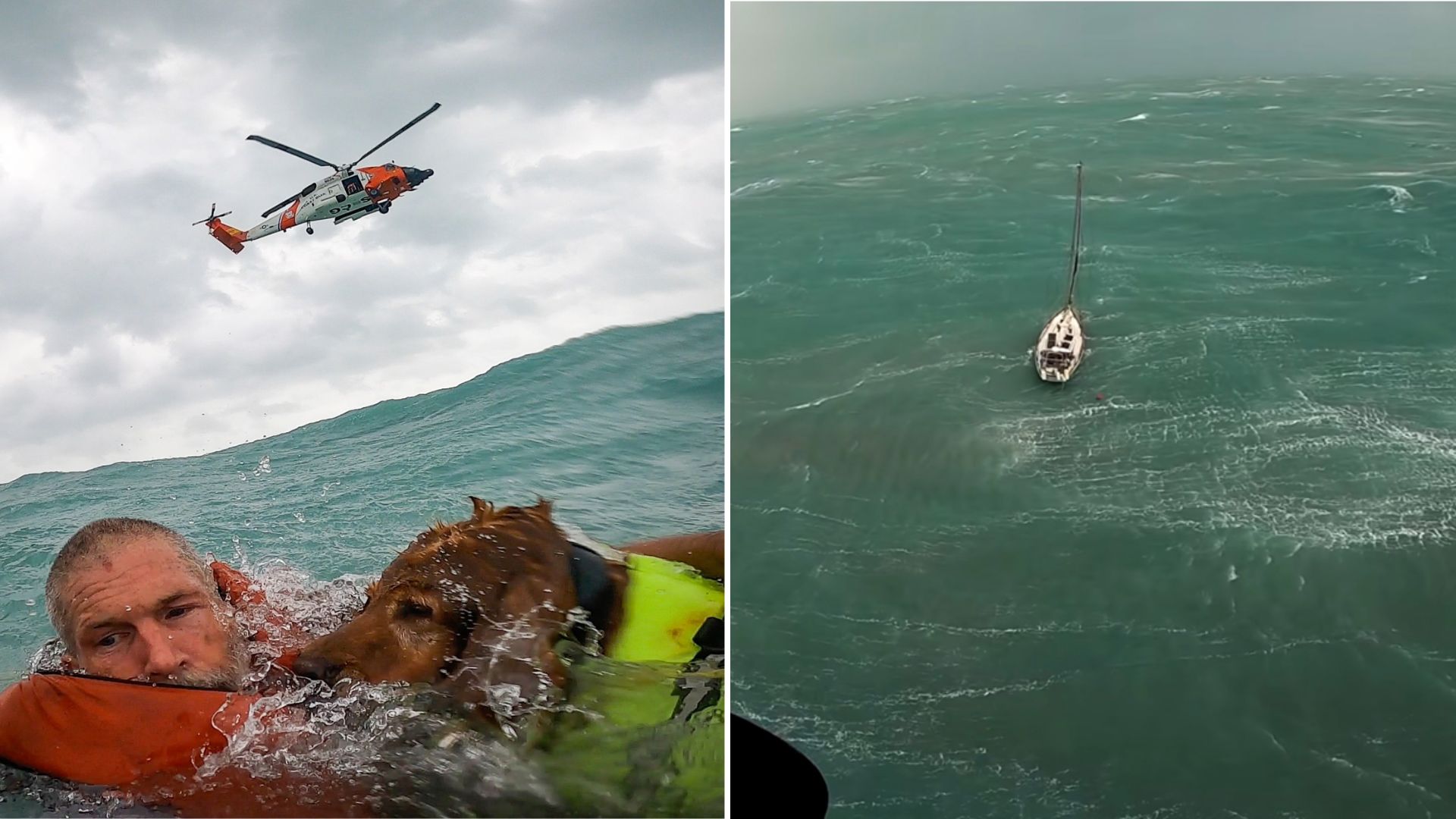 In dramatic video of the rescue, the sailor’s boat is seen alone on choppy waters. A Coast Guard member deploys from an overhead helicopter and guides the man and his canine, both wearing life jackets, to a buoyant safety basket. The duo is then lifted onto the helicopter, where the man shakes hands with his rescuers.