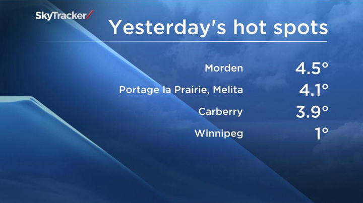 The province’s hot spot was Morden, where the temperature hit 4.5 C. Portage la Prairie and Melita reached highs of 4.1 C, while Carberry was a balmy 3.9 C.