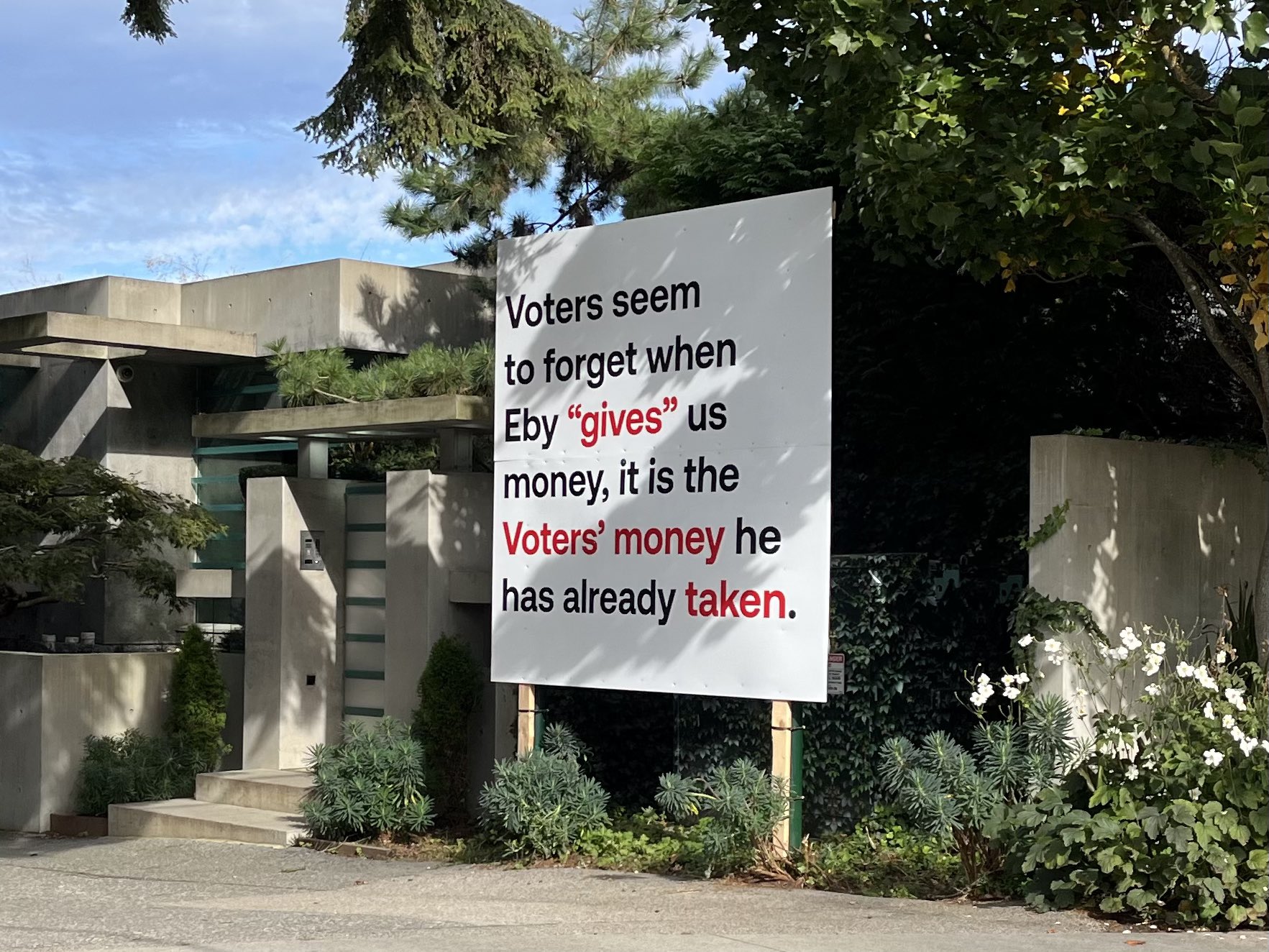 “Voters seem to forget when Eby ‘gives’ us money, it is the Voters’ money he has already taken,” the new sign states.